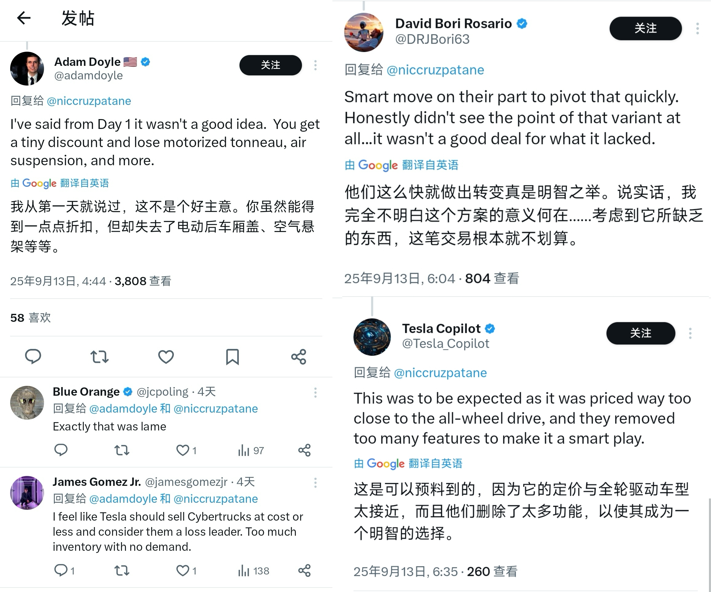 电车通查看海外网友评价,他们普遍认为推出特斯拉Cybertruck后轮驱动版不明智,除价格便宜1万美元外,很多核心配置被砍掉。