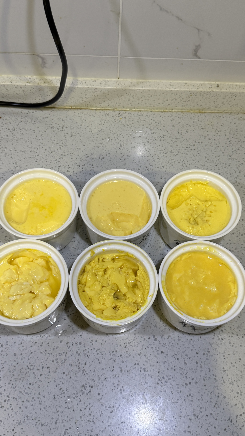 本次测评,我们从电商平台购买了三个品牌(金翼、拜艾格、粮农星厨)共四款预制鸡蛋液产品,价格在7到30元不等,有的品牌全网销量超万件。我们按照商家说明,向量杯内倒入50ml鸡蛋液,以1:2.5倍的比例加水稀释搅匀,倒入大小相同的小碗后上锅蒸煮。同时,我们取两到三颗新鲜鸡蛋打散搅匀后也上锅蒸煮,用于对比。