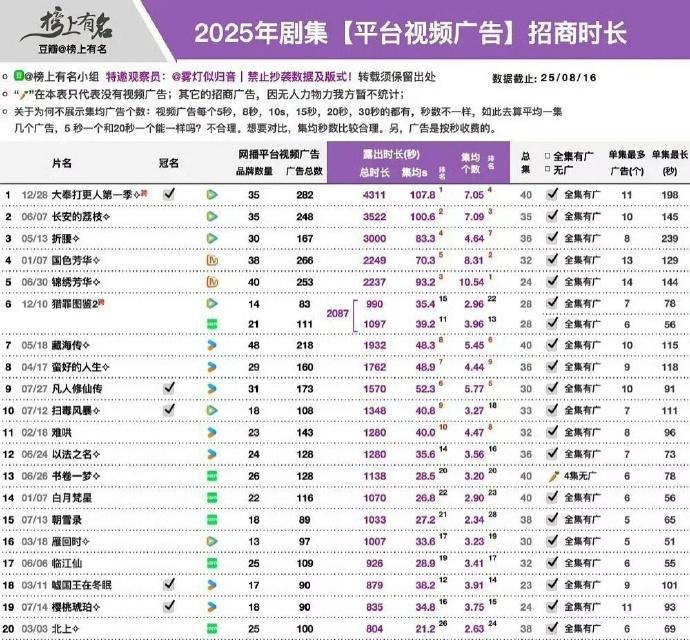 从题材看,古装剧招商基本盘稳定,但全集有广成新考验。豆瓣统计的2025剧集平台视频广告招商时长TOP20中,古装剧占12席;合作品牌数20 + 的15部剧中,古装剧占10席。