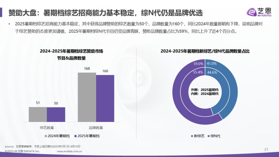 上半年经典综N代播放量下滑,暑期档有所好转,播映指数上升。招商上,综N代吸金力强,相比2024同期,赞助品牌数量占比达59%,同比上升4个百分点。