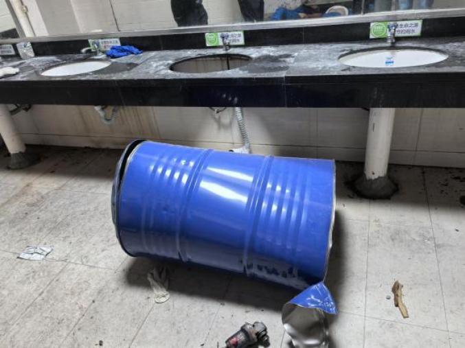 监控视频显示:4月17日12时45分许,陈**、俸**共同前往综合楼一楼楼梯间。随后陈**离开楼梯间前往车间,不久后手拿着一台角磨机返回楼梯间。12时51分许,陈**手持角磨机前往洗手间方向,俸**滚着一个醋酸正丙酯包装桶紧随其后,随后两人消失在洗手间通道尽头拐角处。