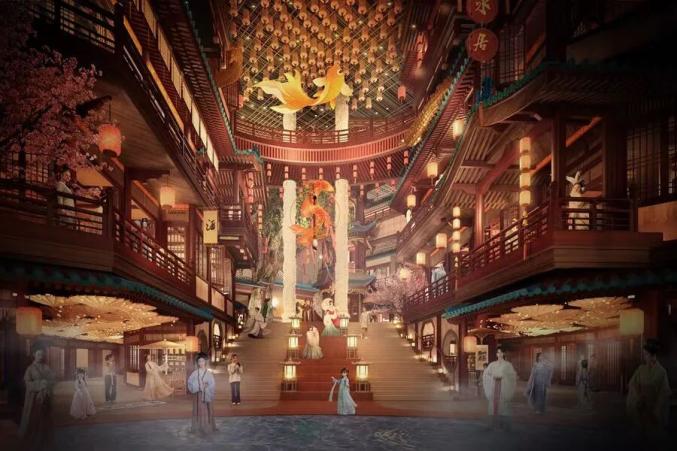 在场景打造上,项目设计以 “大、中、小” 逐层递进的方式,把“金陵四十八景”元素巧妙融入各层空间。除了通往二层台阶上的盘龙柱,二楼正在搭建直通顶部的魁星阁,作为科举文化的载体。从一楼入口处的渡口造型、金陵宫演艺空间,到五楼屋顶花园文娱空间,串起“大明考生泛舟赴举、殿试折桂锦绣金陵、魁阁祈梦金榜题名、金陵文娱入画江南”的文化故事线。