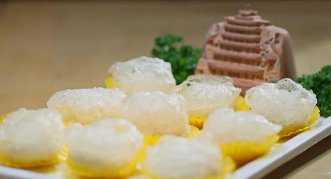 泡儿油糕是从唐代“见风俏”演变而来,在敦煌至少有1200多年历史,据说最早流行于宫廷宴席上。它由面粉搭配猪油、食糖、桃仁、芝麻、玫瑰、豆沙等制成,因其色泽黄亮,表层酥软,又结有密密麻麻的珍珠小泡,故而得名。