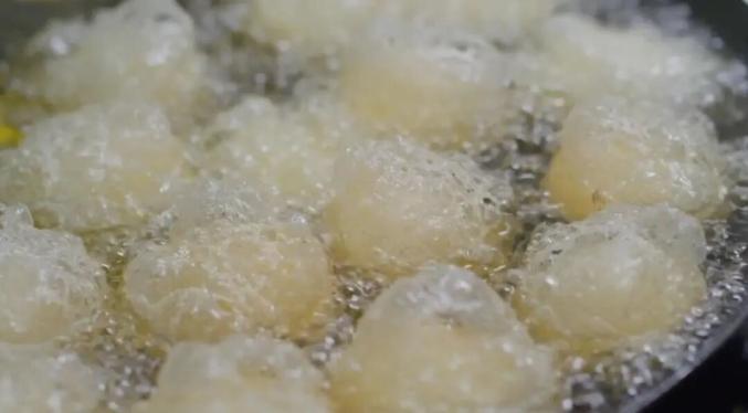 出锅后的泡儿油糕,表层脆酥似飞絮,内里香甜如糯糖,吃起来酥松香甜,入口即化,是市民游客首选的敦煌风味小吃。