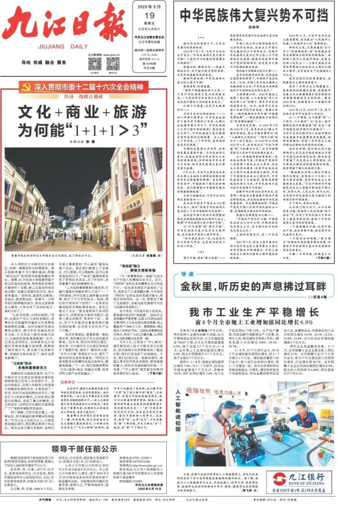 跟着采访团队逛老城区,我发现生活的地方变化巨大:小时候的书店变成了“文化+咖啡”休闲吧;老字号小吃搬进美食街,“日常”成了“特色”;文创集市、非遗手作亮相老街区,孩子们学剪纸、捏面人;邻居阿姨和游客聊老建筑历史……“老”不再是浔阳区的标签,而成了吸引游客、留住乡愁的竞争力。这里有“诗”也有“远方”,老建筑有了新功能,历史文物“活”起来,还留下了烟火气。