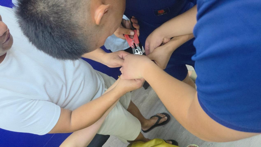 为了避免在操作过程中伤到女士的手指,救援人员先在手指和戒指之间垫上垫片进行隔离保护,然后用小型剪切钳等工具尝试剪断戒指并掰开。但这枚黄金戒指硬度较高,第一次操作没能成功取下戒指。救援人员马上调整策略,先轻轻旋转戒指改变受力点,再用工具重新进行剪切。经过近3分钟的紧张操作,“卡手”的戒指终于被成功取下。