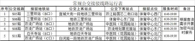 在接驳公交专线的基础上,对途经双流体育中心周边的常规公交线路(S05、S06、S07、S08、S11)进行加密和延时服务,球迷观众可在地铁3号线三里坝站B口(S05、S06)、地铁3号线双流广场站B口(S07、S08)、地铁10号线应天寺站B口(S11)等站点乘车前往双流体育中心。
