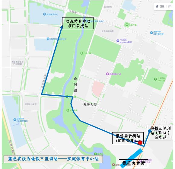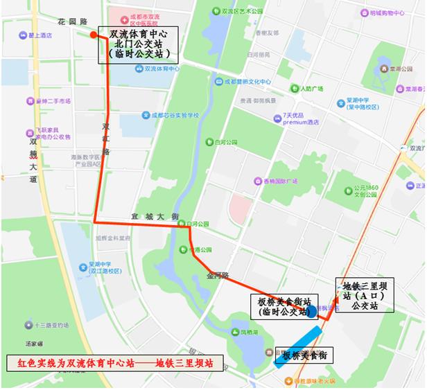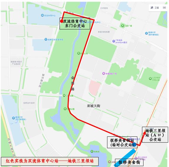 ▶ 看球专线②:地铁三里坝站——板桥美食街站——双流体育中心站。可以乘坐地铁10号线、3号线到达地铁三里坝站(D口) ,步行至地铁三里坝公交站乘坐此专线,运行时间:14:00 - 19:00(赛事日当天),发车频率:30分钟/班(根据客流量动态加密发车频次)。