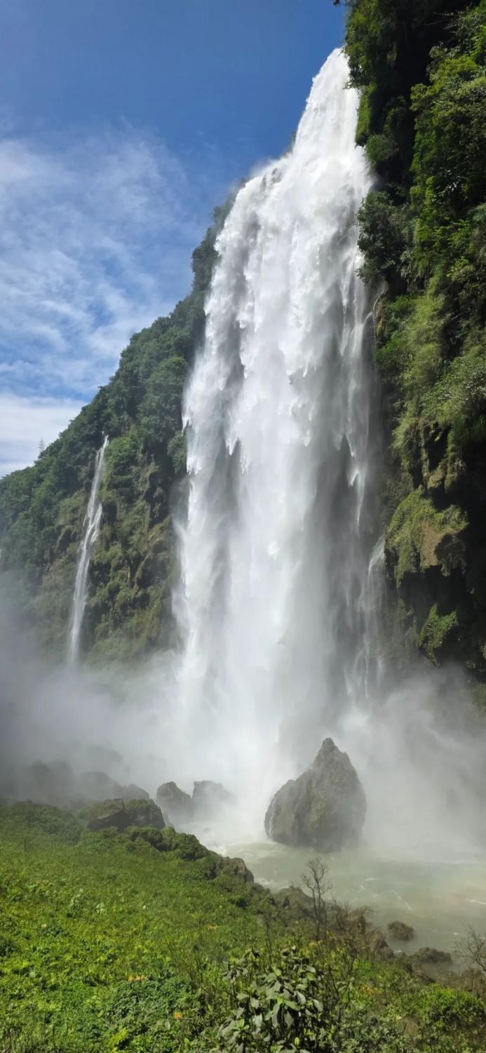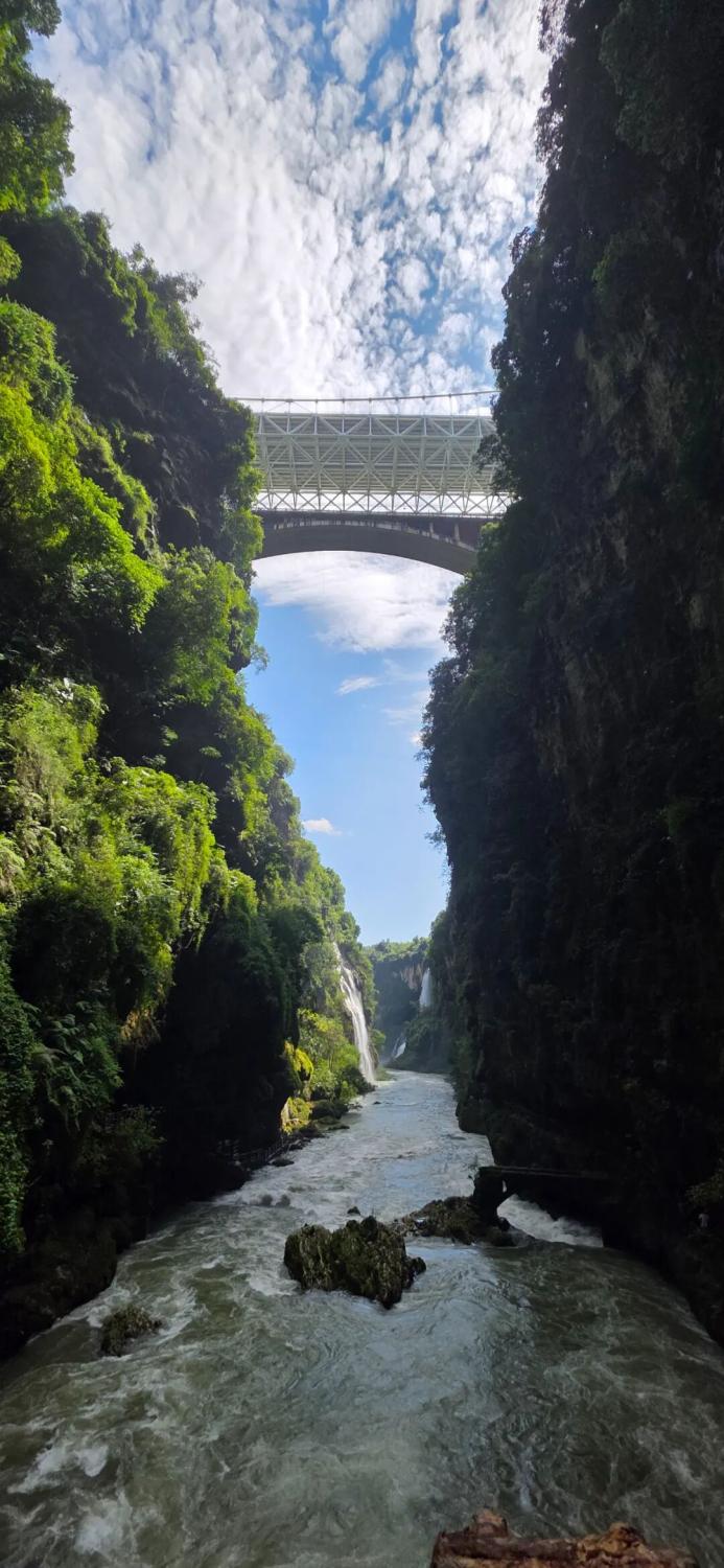 站在桥上往下望,瀑布如银色绸带奔流而下,水雾弥漫,水流撞击岩石声如雷鸣。