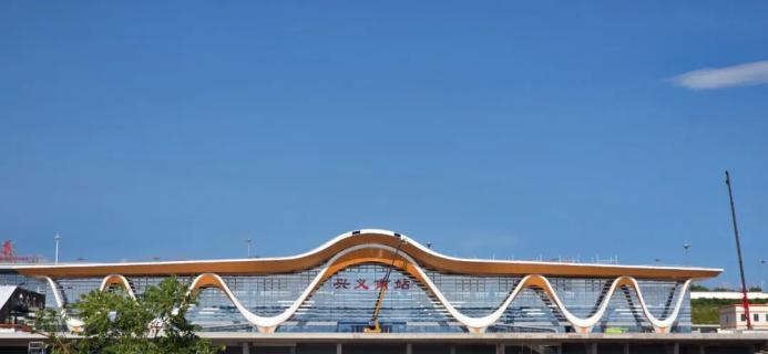 车站建筑有布依族元素,屋顶曲线像传统服饰裙摆,墙面浮雕有稻穗与峰林图案,融合了当地山水文化。站房内工人在收尾,大气规整已呈现。站前广场施工车辆繁忙,为通车做准备。