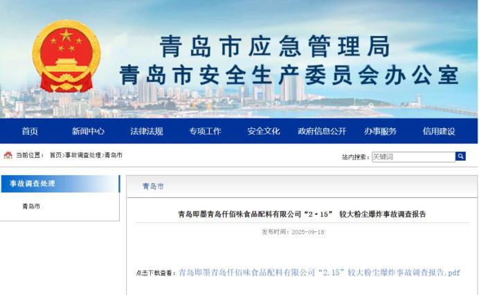2025年2月15日13时6分左右,山东青岛市即墨区的青岛仟佰味食品配料有限公司发生一起较大粉尘爆炸事故,导致5人死亡,直接经济损失约840万元。(此前报道:粉尘爆炸,5人死亡!事发食品配料企业)