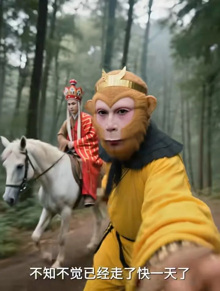 AI能编写唐僧在女儿国留下的后续剧情,制作成熟的vlog影像,刻画孙悟空被压五行山下的孤独感,甚至模拟出它掀翻如来佛祖、不去取经的世界线。一本《西游记》,被自拍杆和第一人称拆成无数片段,每一个会使用AI工具的用户,都能为原著填上自己想要的注脚。