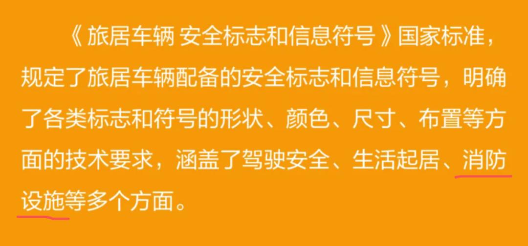 如果说前两项标志让大家觉得“一刀切”,那么消防设施标志的相关规定一定要重视。《旅居车辆 安全标志和信息符号》规定,要专门标注消防设备的位置。
