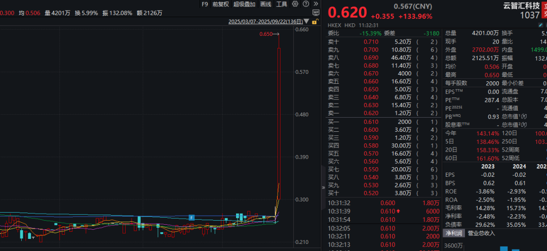 其他大幅波动的港股中,云智汇科技上午盘中大幅上涨,涨幅一度超过140%,随后于上午10时32分起短暂停止买卖,截至停牌前,股价涨133.96%。