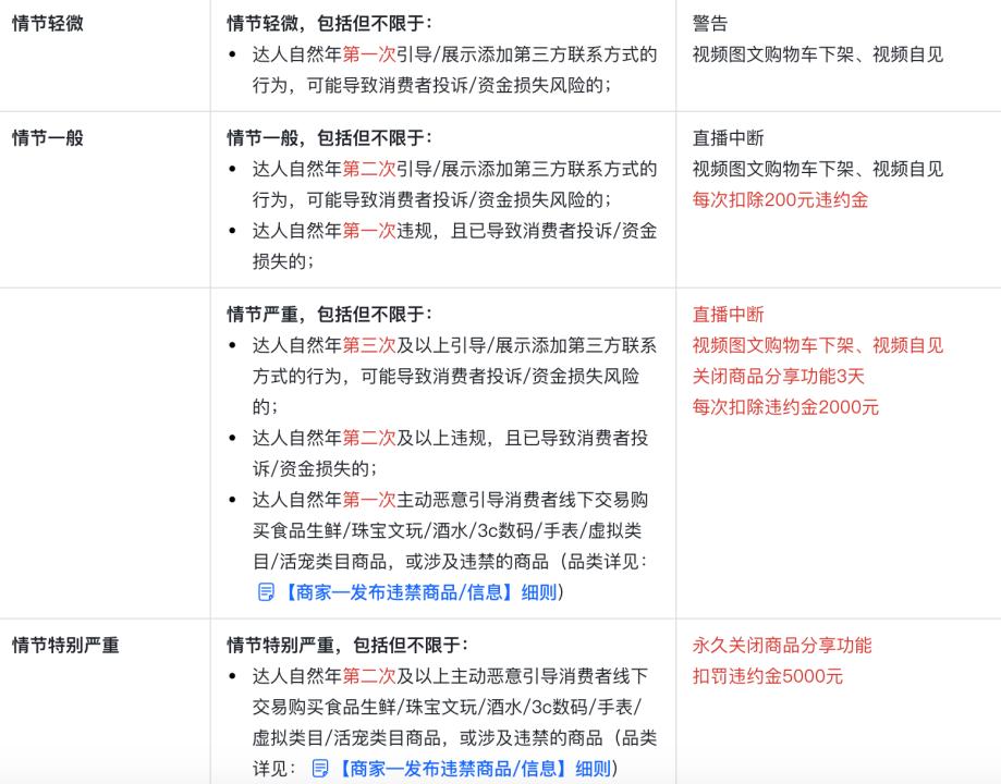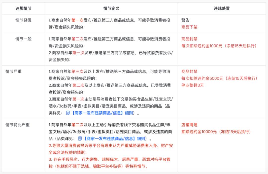 除罚款外,处罚手段更多样、更严厉,包括但不限于:商品下架、永久关闭商品分享功能、商品封禁等,重复与严重情节将触发“店铺清退”等最严惩罚。