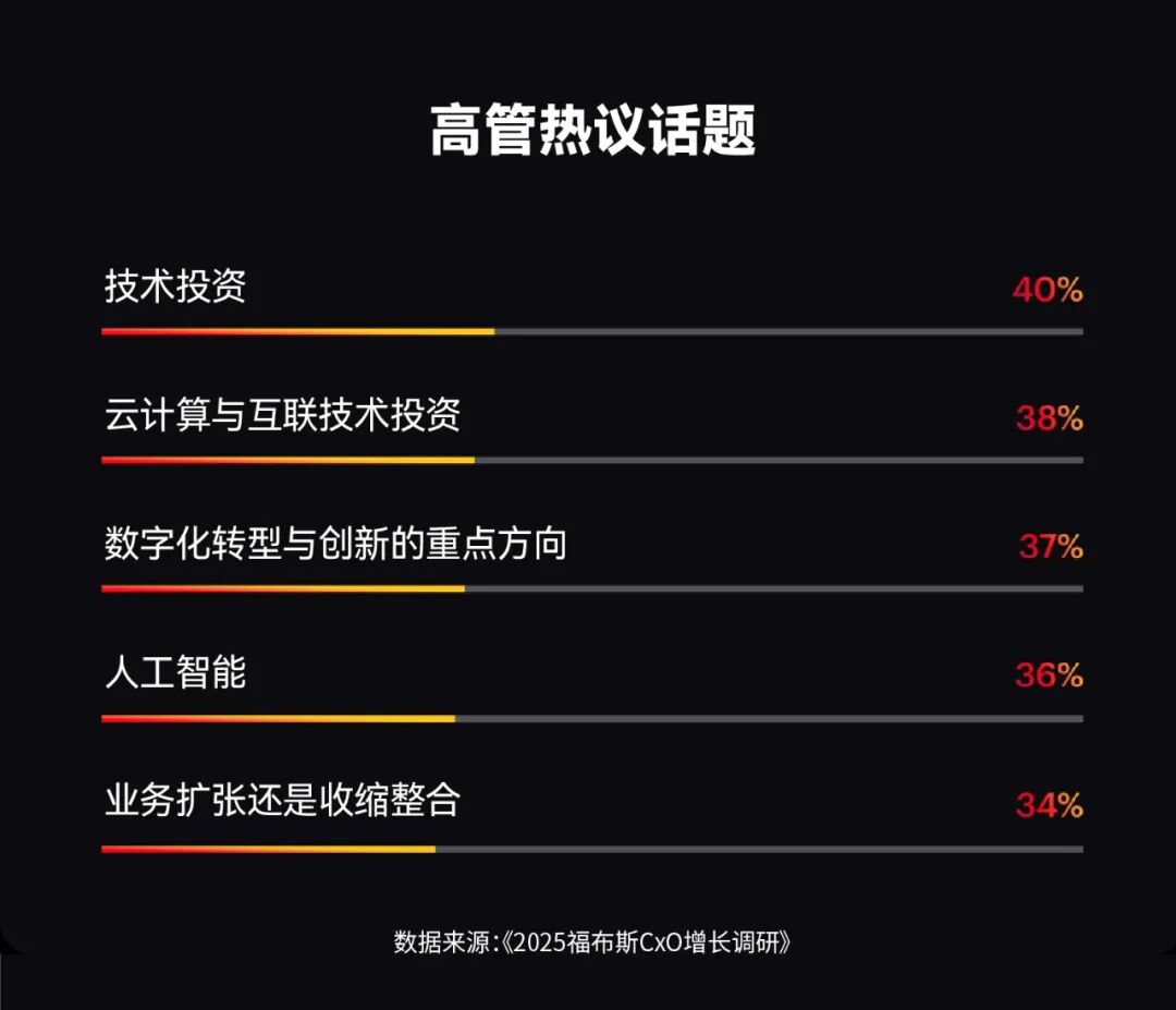 企业高管们讨论最多的话题是什么?《2025福布斯CxO增长调研》给出了答案。不同职能的高管,关注焦点大不相同。