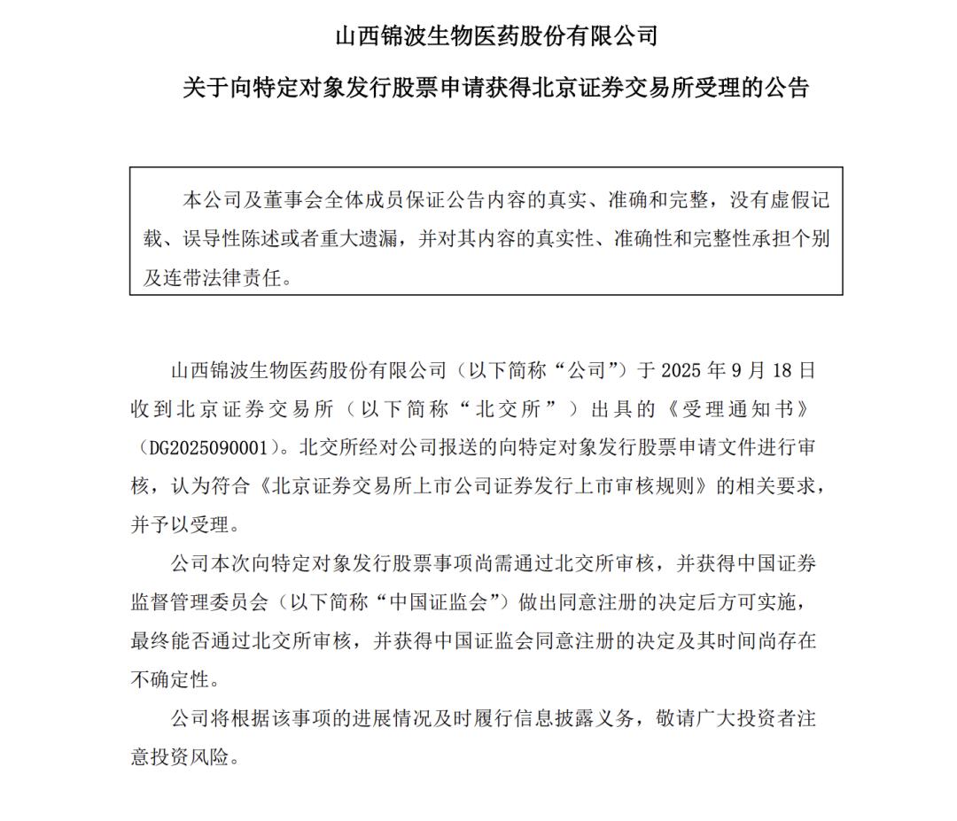 9月19日,北京证券交易所(简称“北交所”)上市公司锦波生物发公告称,公司向特定对象发行股票申请已获受理。