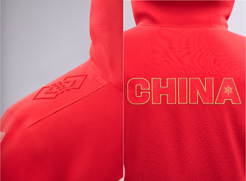 领奖服在肩部、袖口等部位采用传统吉祥寓意纹样——“双胜纹”,该纹样由两个菱形交叠穿插而成,寓意胜利、祥瑞,还在此基础上衍生出“双胜雪花纹”。领奖服背后的CHINA字母纹饰,在夜晚光照后也能清晰可见。