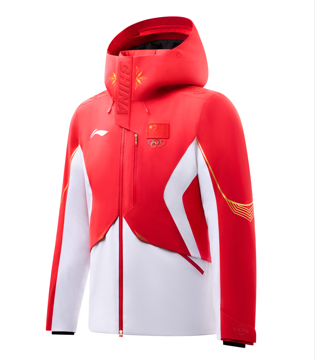 2026年米兰冬奥会中国体育代表团领奖装备以红、白两色为主色调。“中国红”彰显中国文化元素,在正面勾勒出象征着五角星的线条;“雪山白”灵感源自冬季运动场景,融入了东方审美里的留白意境,在侧身勾勒出李宁品牌标识线条,同时搭配以雪道为原型的金色流线型线条为点缀,全身采用上红下白的色彩拼接,凸显中国运动健儿的挺拔身姿。