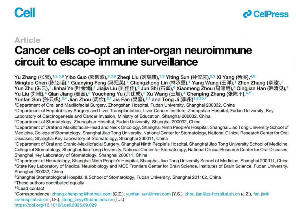 10月24日,复旦大学附属中山医院樊嘉院士、季彤教授、周俭教授及孙云帆教授团队联合上海交通大学张陈平教授,在学术期刊《Cell(细胞)》在线发表了题为Cancer cells co - opt an inter - organ neuroimmune circuit to escape immune surveillance(肿瘤细胞利用跨器官神经免疫轴逃避免疫监视)的研究成果。
