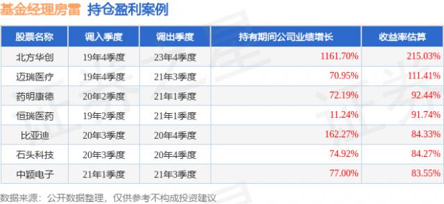 房雷管理的光大保德信动态优选灵活配置混合A基金于2019年4季度买入北方华创,经过4年整的持有后,于2023年4季度卖出。持有期间的估算收益率为215.03%,而且在2019年到2023年,北方华创的年报归属净利润增幅高达1161.7%。