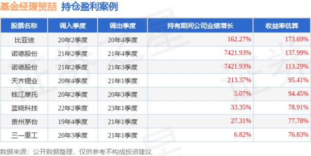 贺喆所管理的华宝制造股票基金于2020年2季度购入比亚迪股票,持有2个季度后,在2020年4季度卖出。持有期间的估算收益率为173.69%,在2019年到2020年,比亚迪年报归属净利润增幅达162.27%。