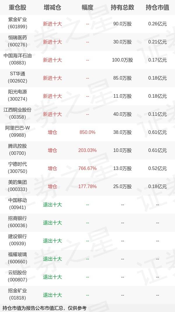 据证券之星消息,10月28日,汇添富基金旗下由吴江宏、陈思行管理的汇添富鑫享添利六个月持有期混合型基金公布三季报,该基金近1年净值增长率达7.25%。与上一季度相比,该基金前十大重仓股有诸多变动。新增了紫金矿业、恒瑞医药、中国海洋石油、ST华通、阳光电源、江西铜业股份;对阿里巴巴 - W增仓34.0万股,使其成为该基金第一大重仓股;而中国移动、招商银行、建设银行、福耀玻璃、云铝股份、招金矿业等则退出了前十大重仓股。详细数据如下:
