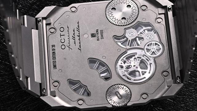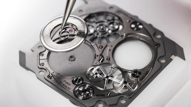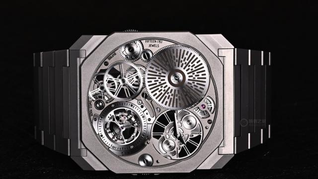 经典的八角形表壳是宝格丽Octo Finissim系列的标志,即便厚度仅1.85毫米,依然采用双层表壳设计。宝格丽能再度突破薄度极限,是因为将表壳底盖与机芯主夹板合二为一,使机芯与表壳相互融合。同时,机芯的轮系全部平铺在一个平面上。