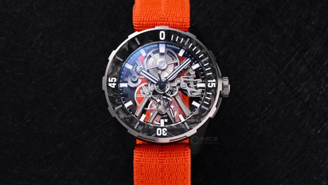 这款腕表如此轻盈,离不开高科技材质的运用,同时表盘大面积镂空,最大程度减少了不必要的重量。其44毫米的表壳,中层90%采用回收再造钛金属材质,侧面使用Nylo ® -Foil尼龙纤维,单向旋转表圈则采用CarbonFoil碳纤维材质。
