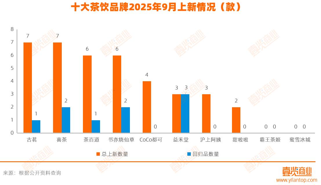 茶饮品牌方面,古茗和喜茶9月并列上新榜首,各推7款新品;茶百道和书亦烧仙草紧随,均上新6款。整体上,主流茶饮品牌秋季产品更新仍较密集。