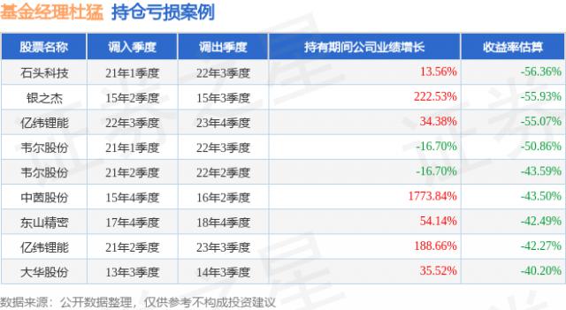 3、石头科技(688169)折戟案例:杜猛管理的摩根远见两年持有期混合基金在2021年1季度买入石头科技,持有1年又2个季度后,在2022年3季度卖出。持有期间的估算收益率为 -56.36%,2021 - 2022年石头科技年报营业总收入增幅达13.56%。