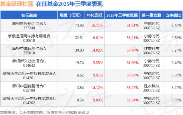 2025年三季度杜猛表现出色,摩根新兴动力混合A基金季度涨幅近62%
