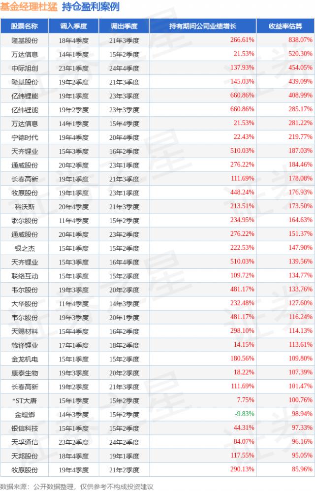 1、隆基股份(601012)翻倍案例:杜猛管理的摩根新兴动力混合A基金于2018年4季度买入隆基股份,持有2年又3个季度后,在2021年3季度卖出。持有期间的估算收益率高达838.07%,2018 - 2021年隆基股份年报营业总收入增幅达266.61%。