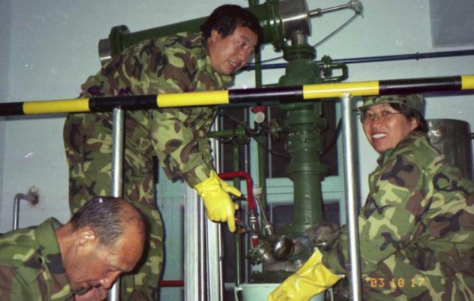 2003年张治军(左二)与同事调试实验装置