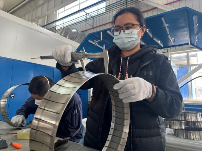 质检员陈静正在仔细检测喷涂好的零件。她表示:“每个零件都要检测,先检查外观和尺寸,看涂层的厚度和宽度是否符合图纸要求,不符合的不能出厂。”