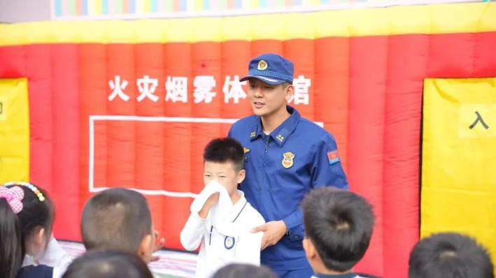 走进模拟烟房,刺鼻“烟雾”让孩子们警惕起来。在教官帮助下,他们用湿毛巾捂住口鼻,弯腰摸索着穿过通道,感受“火场逃生”的紧张,掌握烟房逃生技巧。