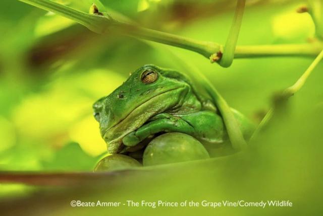 “青蛙王子”懒洋洋趴在葡萄藤下,把藤蔓和葡萄当王宫。