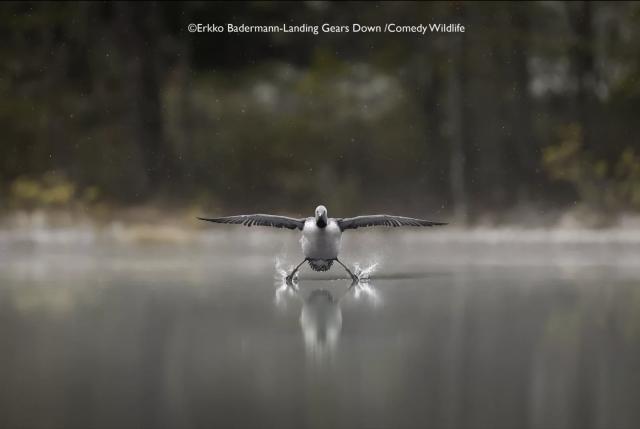 贴着水面滑行本应优雅,但劈叉滑行就有点奇特了。摄影师Erkko Badermann拍红喉潜鸟多年,有时会在池塘边缘伪装网下拍摄它们春季求偶表演。在一个雪雾清晨,他拍到飞鸟着陆搞笑场景。他吐槽红喉潜鸟飞行能力一般,降落时较摇晃,会把腿向后伸展平衡身体,用腹部着陆滑行,把水面当跑道。不过,红喉潜鸟是出色的潜水员,能潜入水下七八米捕食鱼类。
