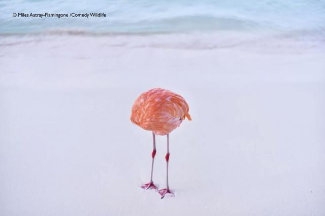 这不是AI生成的无头火烈鸟图片,这只火烈鸟在加勒比海滩把头埋在身子里清洁羽毛,你能找到它的头吗?