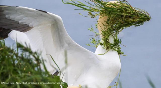 摄影师Alison Tuck在英国贝姆普顿悬崖(Bempton Cliffs)捕捉到有趣一幕:一团草拍到一只倒霉鸟上。这只鸟是鲣鸟,喜欢在悬崖上筑巢,悬崖边开阔的空间和强劲海风有助于它们起飞,但这只鲣鸟可能在准备起飞前被草糊了一脸。