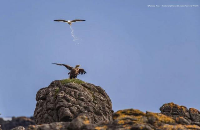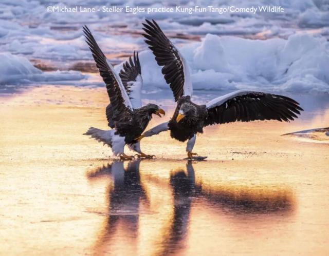 虎头海雕是世界上最重的鹰,体重可达9公斤,翼展可达2.5米,分布在俄罗斯北部、日本北部和韩国,现存约4500只成年个体。冬季,日本北部北海道是拍摄猛禽的好地方,气温常降至零下18摄氏度。2月和3月,北海道罗臼(Rausu)附近海岸有大片浮冰,摄影师Michael Lane在前往浮冰区的船上拍下“功夫探戈”这张照片。