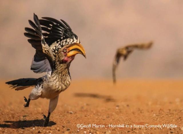 在南非齐曼加(Zimanga)的隐蔽拍摄点,摄影师Geoff Martin等白背秃鹫时,一只南方黄嘴犀鸟闯入镜头挡住视线。这时,一只栗翅鹰掠过,犀鸟吓得逃命狂奔。