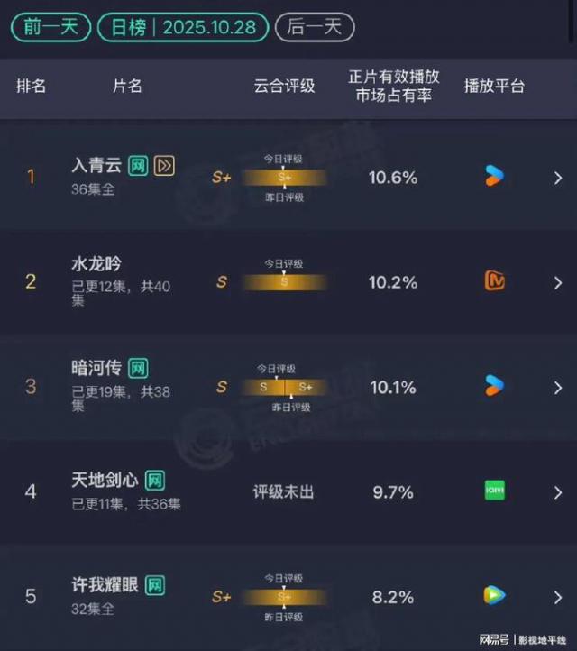 从云合最新数据来看,《入青云》全部完结后,尽管热度仍在,但会逐渐减退。届时,《水龙吟》和《暗河传》极有可能争夺第一名的宝座。