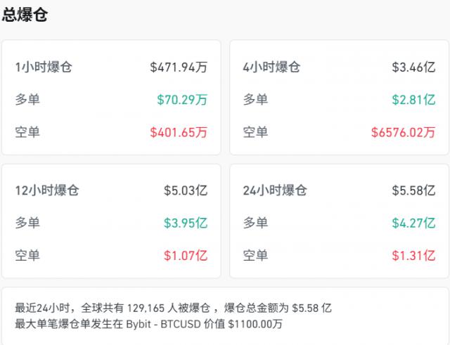 比特币短线走低,近24小时内市场近13万人被爆仓,爆仓金额达约5.6亿美元。