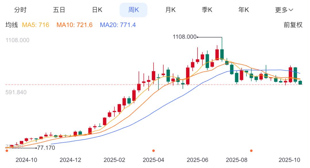 今年老铺黄金股价曾冲高,7月11日达1108港元最高点,较发行价涨幅超26倍。之后震荡下行,10月28日收盘价667.5港元,回调近40%,市值回落至1153亿港元。