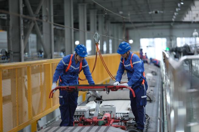 工作人员正在对新线列车进行细致检查