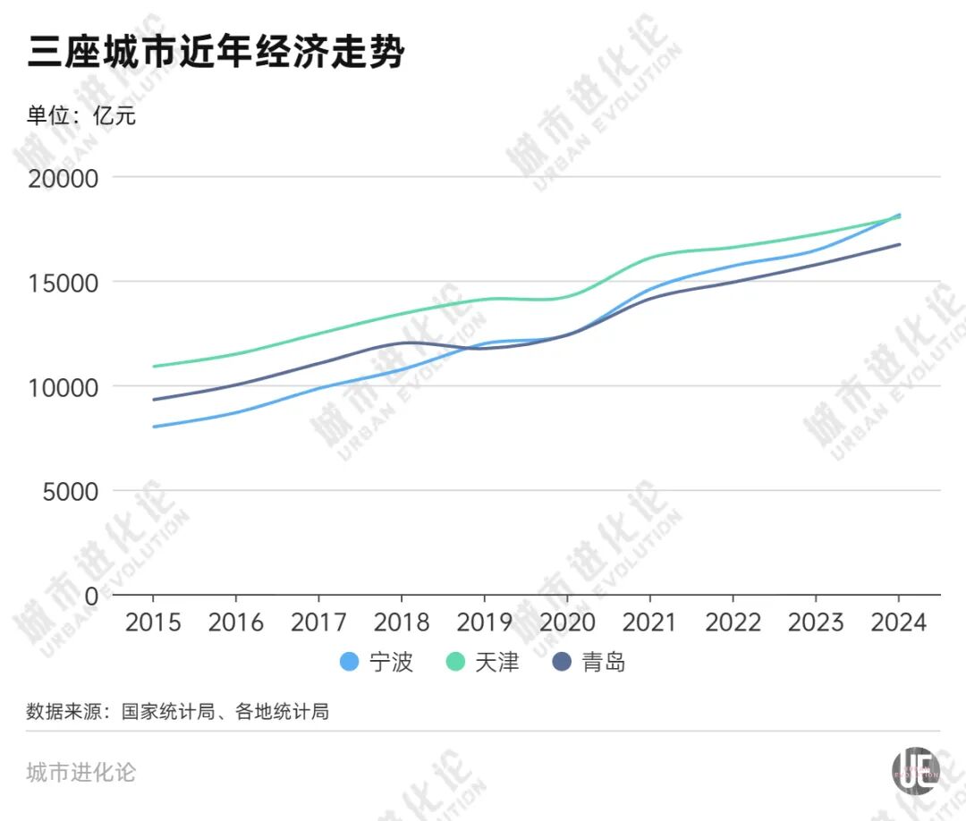 不过,正如当地媒体分析的那样,青岛对天津和宁波的追赶,可能与这两座城市目前面临不同程度的挑战有关——天津产业结构仍以石化、钢铁等传统重工业为主,新兴产业尚未崛起;宁波则在外部环境变化下,受到的冲击比其他城市更大。