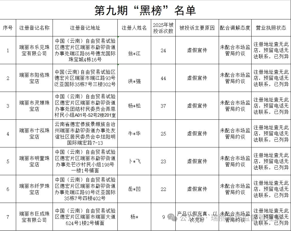 为加大对珠宝翡翠直播乱象的治理力度,有效规范直播行为,维护诚信经营秩序,切实保障消费者权益,近期,瑞丽市市场监督管理局对翡翠直播相关消费投诉进行了梳理。针对被投诉次数较多的商家,开展了约谈提醒工作。同时,将部分不配合解决投诉、态度恶劣,或通过注册地址和联系电话无法取得联系的商家,以“黑榜”形式予以公示。