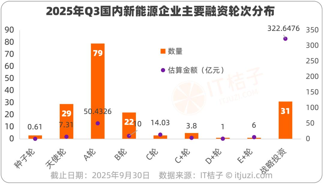 2025年三季度,新能源赛道各融资轮次数量分布呈现“早期与成长期并重、战略投资活跃”特点。其中,A轮融资以79笔成为当期最核心融资轮次,战略投资有31笔紧随其后,天使轮有29笔。