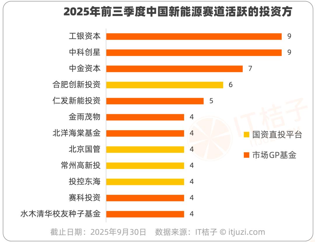 2025年前三季度,国内新能源赛道投资方阵营呈现“市场化GP与国资平台协同发力”态势,两类主体在资金布局上各有侧重。中科创星、工银资本均以9次投资数并列为最活跃的新能源投资方。中科创星以早期投资见长,近期投资了“中科亿氨”(创新能源)、锂泰新能源(电池安全防控制剂)两家新能源初创企业。工银资本以中后期投资为主,最新参与了“卫蓝新能源”(固态锂电池)的D + 轮融资、富川新能(风力发电)的投资,两者发展相对比较成熟。合肥创新投资在地方国资背景的投资方中表现突出,今年投资了星能玄光等新能源企业。值得一提的是,一家成立于2019年、专注于新能源领域的新兴投资机构——仁发新能投资,凭借在2025年前9个月出手了氢环能源(生物绿氢)、光献科技(光伏储能)、星能玄光(可控核聚变电站)等项目,跻身国内活跃的新能源投资机构前五名。另外,还有2家具有校友系的基金——水木清华校友种子基金(清华大学)、北洋海棠基金(天津大学),他们主要依托当地企业家校友圈子投资,也活跃在新能源投资的一线阵地。